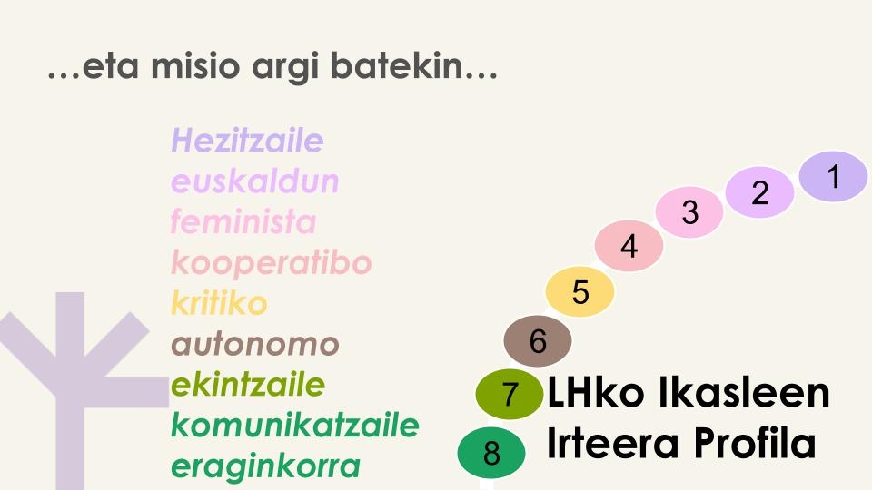 Hezkuntza komunitatearekiko eta profesioarekiko atxikimendu eta konpromisua duena. Gizartearekiko erantzukizunaz jokatuko duena eta horretarako etengabeko berrikuntzan eguneratuta egongo dena.