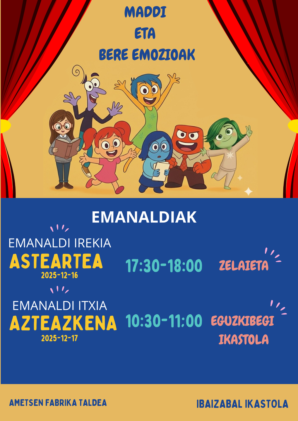 Urtero bezala, Ibaizabal Ikastolako Haur Hezkuntzako Goi Mailako Zikloko lehenengo mailako ikasleek haurrei zuzenduriko ikuskizunak sortu dituzte. Diziplinarteko erronka honek ordu askotako lana izan da, lan handia egin dute ikasleek eta orain erronka publikoaren aurrean aurkeztea tokatzen zaigu.